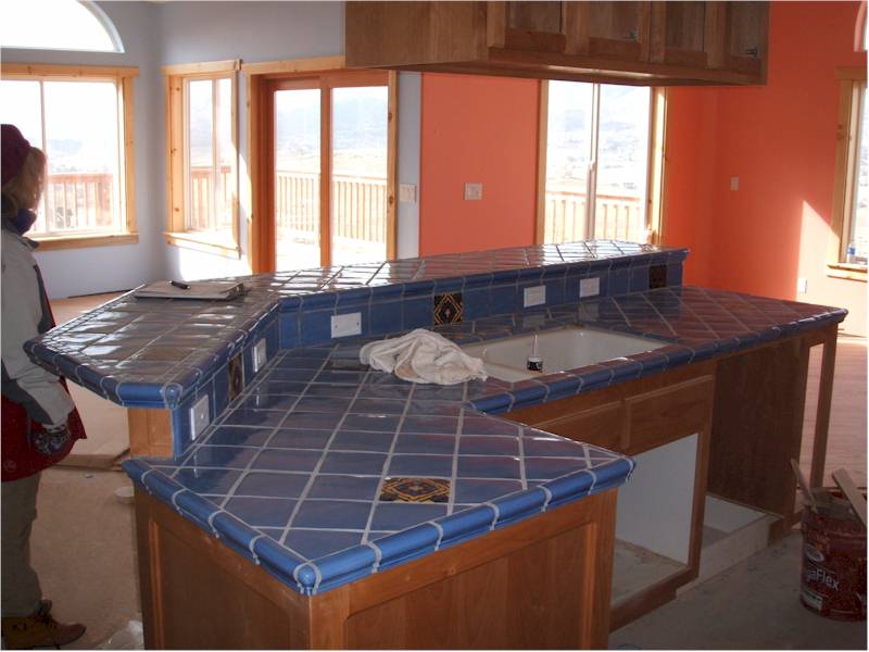 At any rate, by the end of January, the trim was done and the kitchen counter was started. By February 8th, when I added this set of pictures, the kitchen counters were complete and the oak flooring was about 2/3 installed (but not finished yet). These pictures show the finished trim, the kitchen counter, some of the ceiling fans, the tiled fireplace, the finished shower tiling and the floors going in.